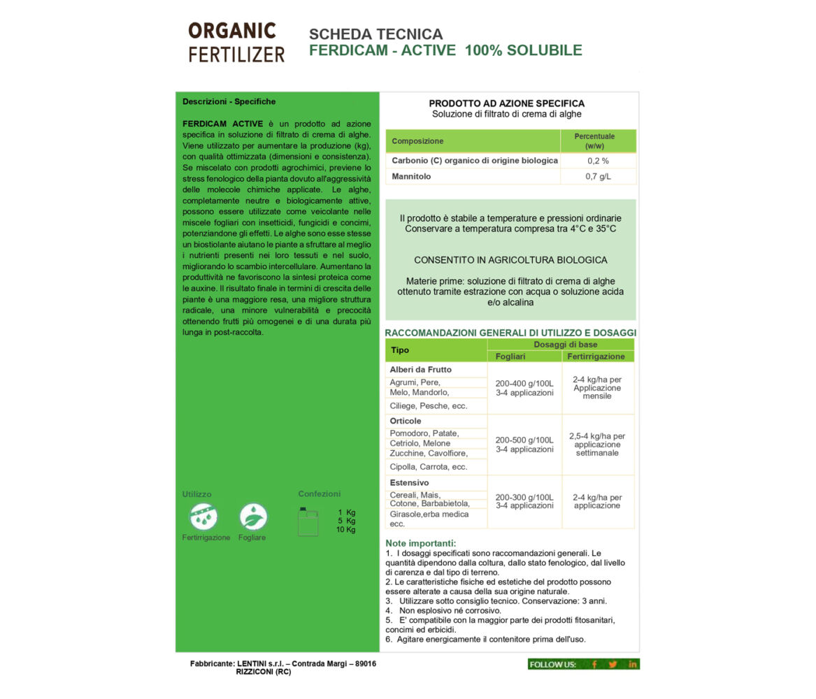L’azienda Lentini srl di Rizziconi (Reggio Calabria) distribuisce Ferdicam, fertilizzante organico vegetale indicato per la prevenzione e la correzione di azoto, fosforo e potassio. Ferdicam favorisce la crescita e il vigore di tutte le piante ed è privo di cloruri. Può essere applicato sia per via fogliare che per fertirriga-zione in tutti i tipi di colture durante qualsiasi fase del ciclo vegetativo.